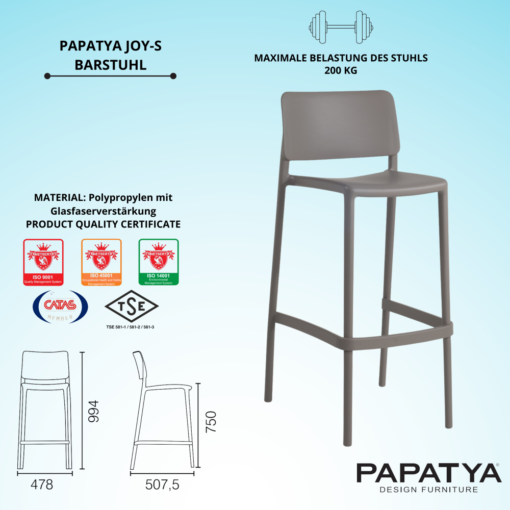 Joy Barhocker mit einer Sitzhöhe von 75 cm, hat alle Vorteile von Schlichtheit, glatten Linien, Silhouette und Gewicht. Feine Details aus glasfaserverstärktem Polypropylen, wie aus Stein gemeißelt, schaffen einen starken und bequemen Sitz. Geeignet für den Außen- und Innenbereich. Es wurde speziell für öffentliche Bereiche entwickelt und eignet sich sowohl für den privaten als auch für den professionellen Gebrauch. Ausgelegt für eine maximale Belastung von 200 kg.