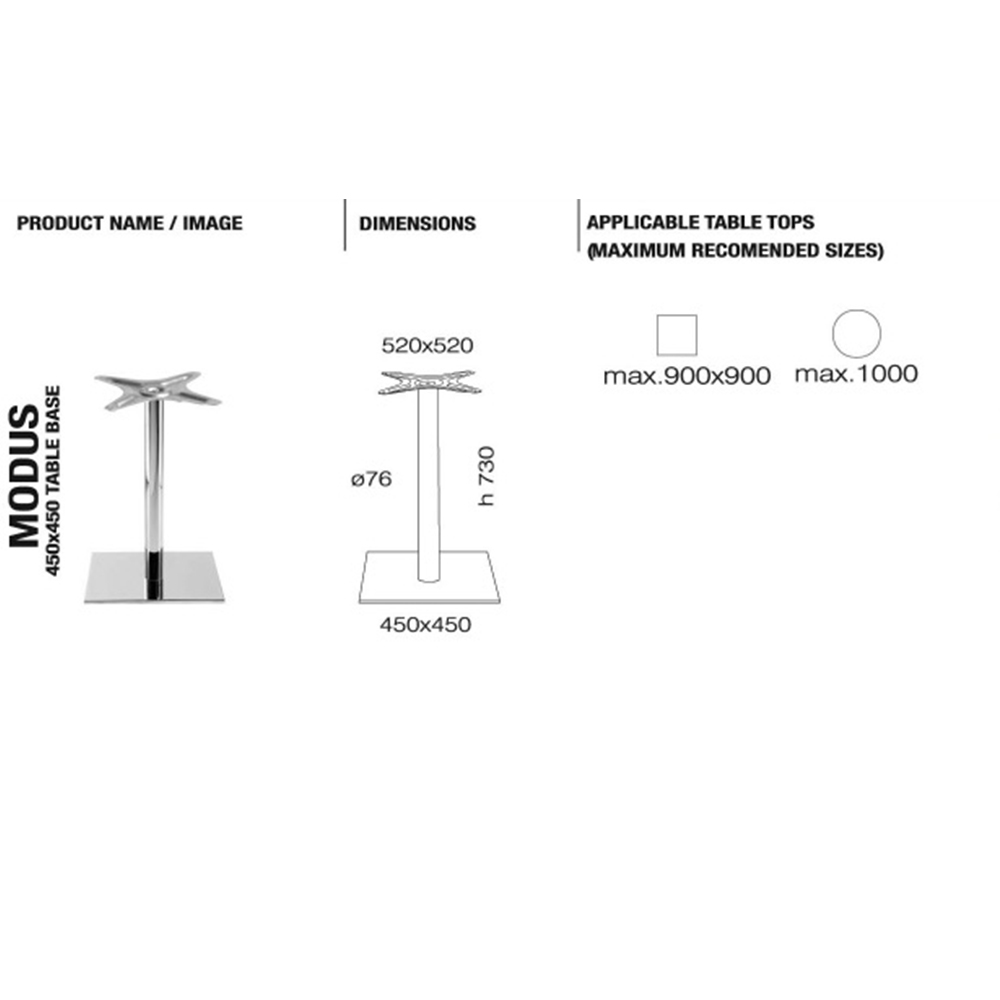 Modus Tischfuß 45x45x73 cm chrome – verchromt Unterstützung für Tischov im modernen Stil. Die Brillanz und Anmut des Sockels für Tisch bringt besondere Harmonie und Eleganz ins Interieur. Perfekt kombinierbar mit Stühlen auf verchromten Beinen, und die Tischplatte kann aus jedem Material Ihrer Wahl gewählt werden: Holz, Marmor, strapazierfähiger Teakholz-Kunststoff, MDF, laminierte Spanplatte und andere. Eine einfache Montage einer Stütze an einer Tischplatte erfordert keine besonderen Kenntnisse, dank dessen können Sie sich ganz einfach einen stilvollen Büro- oder Esstisch bauen. Nur im Innenbereich verwenden.