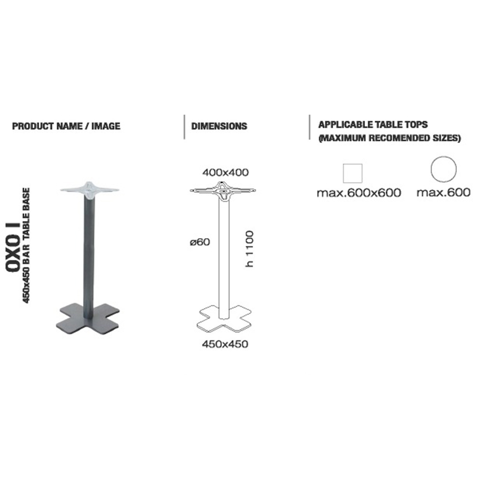 Oxo Tischfuß bar base 45x45x110 cm Elektrophoretische Abscheidung Matt-Schwarz hat eine Basis in Form des Buchstabens X, die gleichzeitig in einem einfachen und extravaganten Stil gefertigt ist. Die Brillanz und Anmut des Sockels für Tisch bringt besondere Harmonie und Eleganz ins Interieur. Perfekt kombinierbar mit Stühlemi, und die Tischplatte kann aus jedem Material Ihrer Wahl gewählt werden: Holz, Marmor, strapazierfähiger Teakholz-Kunststoff, MDF, laminierte Spanplatte und andere. Eine einfache Montage einer Stütze an einer Tischplatte erfordert keine besonderen Kenntnisse, dank dessen können Sie sich ganz einfach einen stilvollen Büro- oder Esstisch bauen. Kann draußen und drinnen verwendet werden.