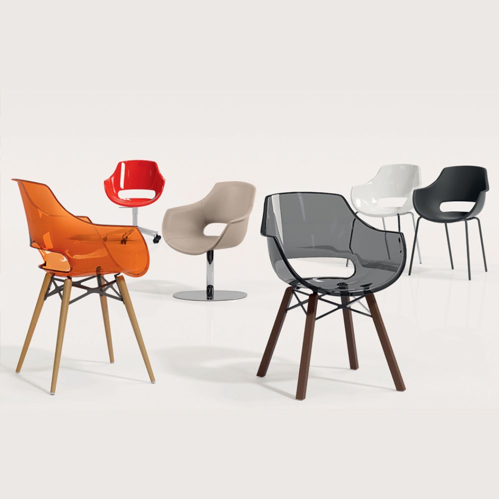 Opal Chief Sessel aus Polycarbonat mit höhenverstellbarem Drehfuß auf Rollen, 3 Fußvarianten zur Auswahl. UV-stabilisiert. Der Opal-Sessel ist auch in einer vollgepolsterten Version erhältlich. Es bereichert Tischets und verleiht dem Interieur einen besonderen Charakter.