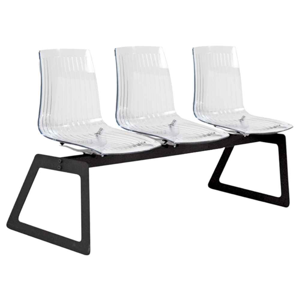 Die Bank ist für Wartezimmer geeignet, sie besteht aus transparentem Polycarbonat, die Basis besteht aus einem Stahlrahmen. Die Bank wird mit 2, 3, 4 und 5 Sitzen angeboten, es ist möglich, ein kompaktes horizontales Regal für Dinge zu installieren, alle Herstellungsoptionen können in der Preisliste oder vom Manager angegeben werden. Die Polymere, aus denen die Stühle hergestellt sind, enthalten Schutz vor UV-Strahlen und antistatische Zusätze, wodurch sie sowohl im Innen- als auch im Außenbereich verwendet werden können (mit Ausnahme von Chrombasen). Ausgelegt für eine Belastung von bis zu 500 kg.