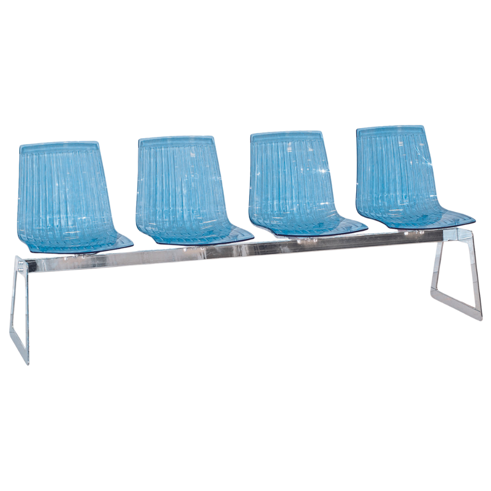 Die Bank ist für Wartezimmer geeignet, sie besteht aus transparentem Polycarbonat, die Basis besteht aus einem Stahlrahmen. Die Bank wird mit 2, 3, 4 und 5 Sitzen angeboten, es ist möglich, ein kompaktes horizontales Regal für Dinge zu installieren, alle Herstellungsoptionen können in der Preisliste oder vom Manager angegeben werden. Die Polymere, aus denen die Stühle hergestellt sind, enthalten Schutz vor UV-Strahlen und antistatische Zusätze, wodurch sie sowohl im Innen- als auch im Außenbereich verwendet werden können (mit Ausnahme von Chrombasen). Ausgelegt für eine Belastung von bis zu 700 kg.