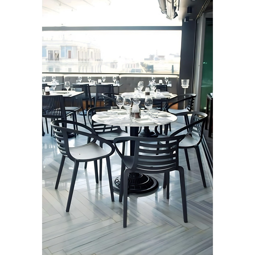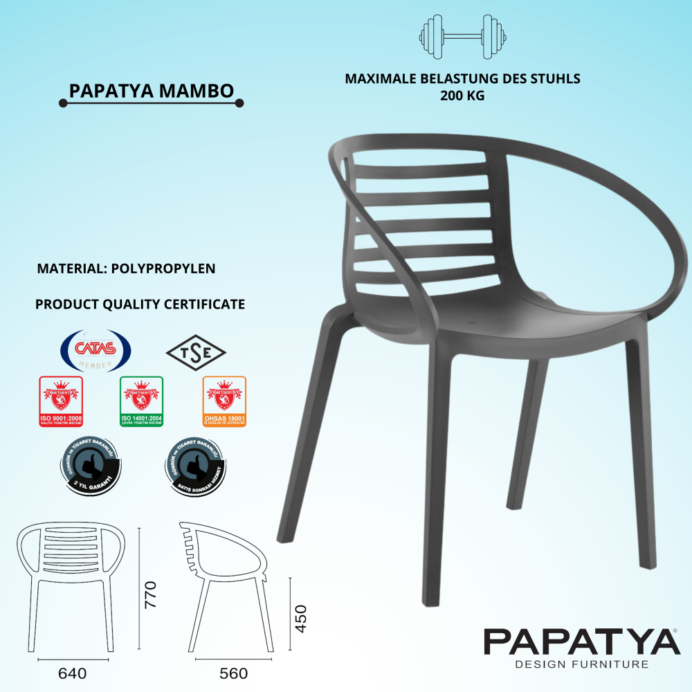 Bequemer und stilvoller Monoblock-Sessel Mambo verleiht dem Interieur Charakter und Persönlichkeit. Das Modell hat eine ergonomische Form, Sitzfläche und Stuhllehne sorgen für ein angenehmes Tragegefühl. Sessel kann in Wohngebieten, an öffentlichen Orten - Cafés, Bars, Restaurants sowie auf der Straße verwendet werden. Ein langlebiges und verschleißfestes Produkt hält starker Beanspruchung stand und behält während der gesamten Lebensdauer ein hervorragendes Aussehen und eine einwandfreie Qualität. Sessel besteht aus glasfaserverstärktem Polypropylen: Material ist beständig gegen Kälte und hohe Temperaturen, Feuchtigkeit, UV-Strahlung. Stapelbar bis 9 Stk..