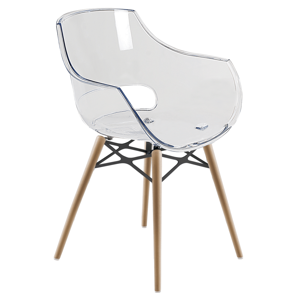 Ein heller Akzent im Interieur des Wohnzimmers, Schlafzimmers, Kinderzimmers oder Essbereichs wird der Designer Sessel Opal-Wox sein. Es kann auch bei der Ausstattung eines Arbeitszimmers oder Büros verwendet werden. Ergonomisches Modell mit bequemem Sitz und halbkreisförmiger Rückenlehne sorgt für eine bequeme Passform. Der Stuhla-Basisblock besteht aus vier sich verjüngenden Beinen aus Buchenholz-Massivholz. An den Beinen sind untereinander gekreuzte Metallstangen befestigt. Nahtloser, transparenter Sessel aus Polycarbonat - ein strapazierfähiges Material, das widerstandsfähig gegen Kratzer, mechanische Beschädigungen und Feuchtigkeit ist. Sesselbeine sind mit rutschfesten Polyurethan-Endkappen ausgestattet. Sessel wird nur für den Innenbereich empfohlen.