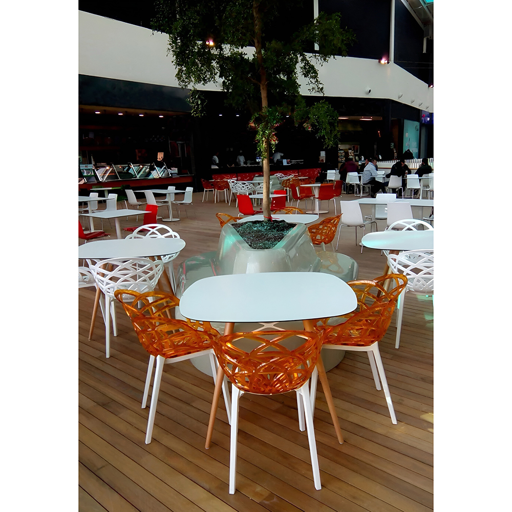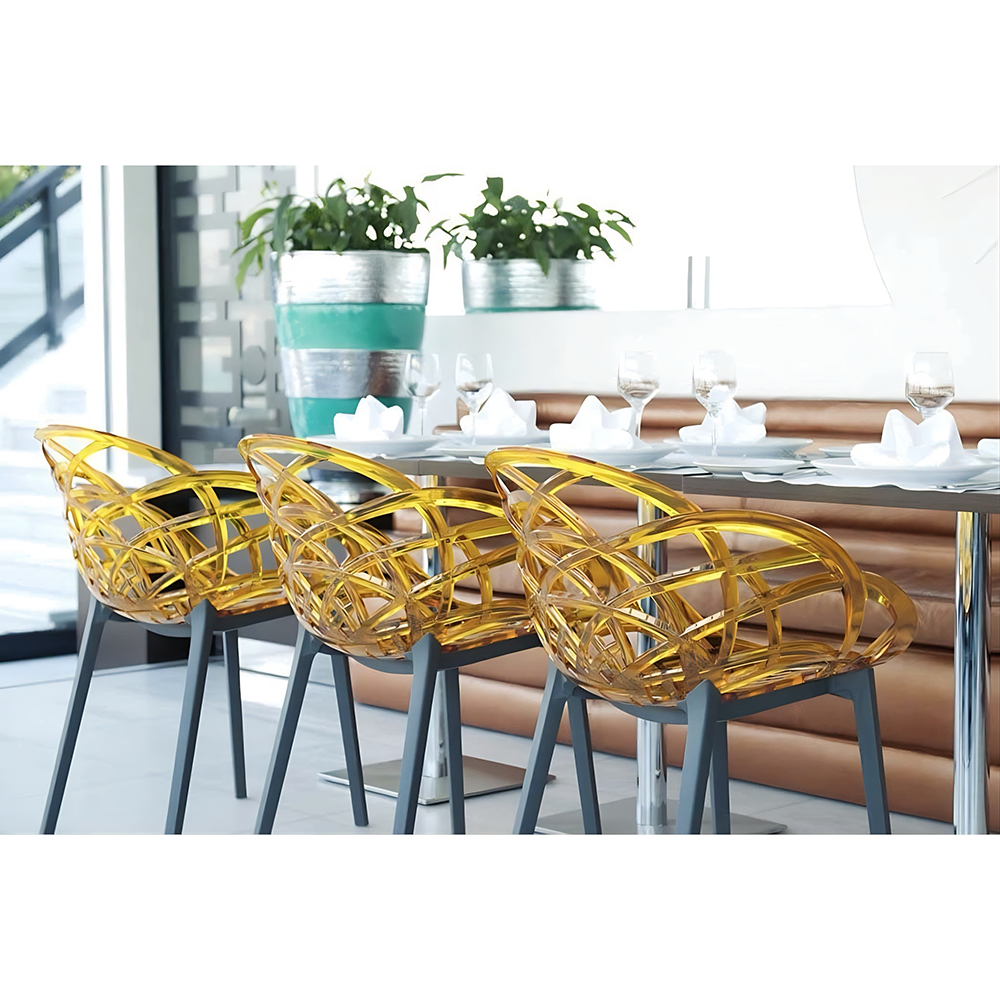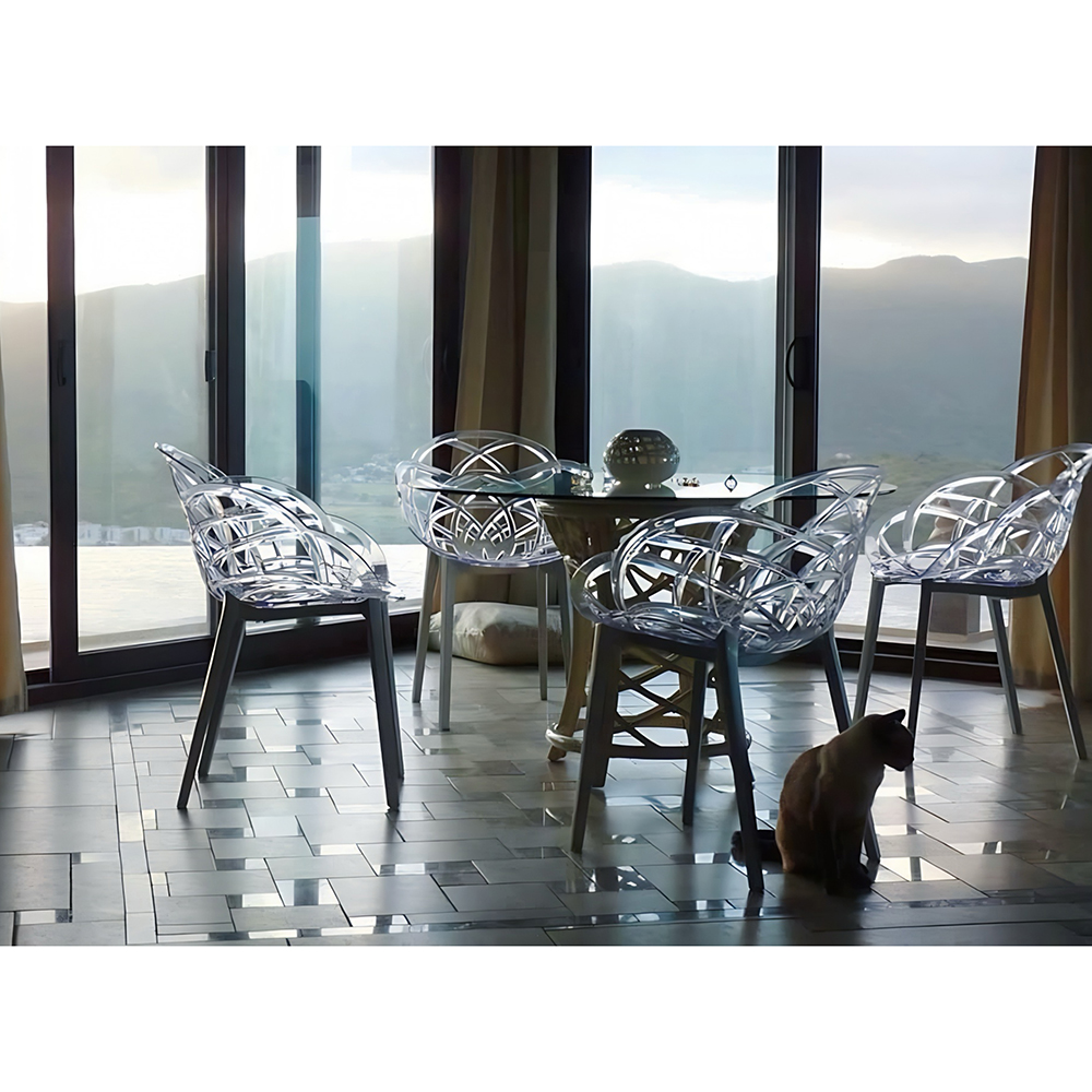 Der durchbrochene Sessel Flora erinnert an die zarte Blume. Die sanften Rundungen des Stuhls sorgen für ein bequemes Sitzen und Stuhllehne, stabile Sesselbeine, machen ihn so bequem wie möglich. Die Sitzfläche besteht aus Polycarbonat, die Basis aus Polypropylen, Sesselbeine sind mit rutschfesten Polyurethan-Endkappen ausgestattet. Der Sessel besteht aus strapazierfähigen Materialien, die kratzfest, mechanisch und feuchtigkeitsbeständig sind. Wunderbar für Innenraum von Wohnzimmer, Schlafzimmer, Essbereich. Es kann für die Einrichtung der Räumlichkeiten eines Cafés oder Restaurants verwendet werden. Kann im Innen- und Außenbereich verwendet werden.