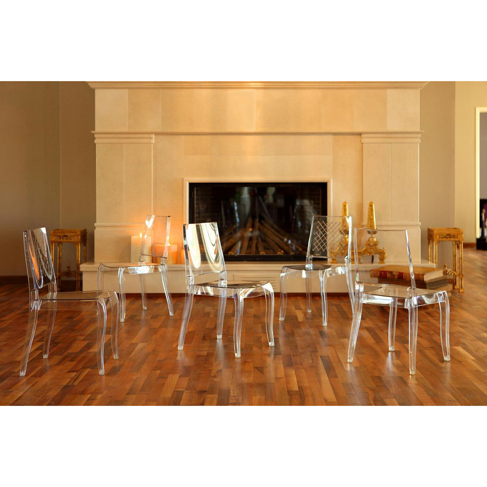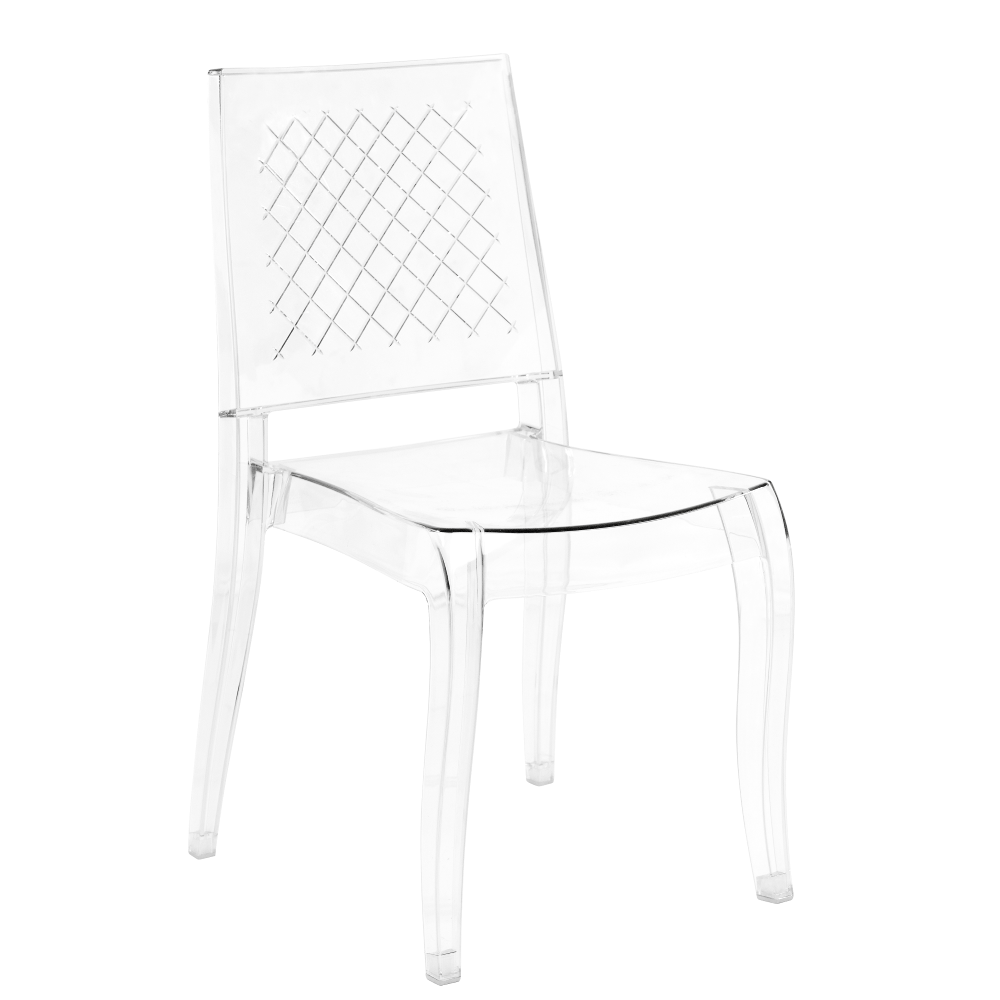 Der aus transparentem Polycarbonat gefertigte Stuhl Class-XC fügt sich dank seines nahezu unsichtbaren Designs perfekt in jedes Interieur ein. Ideal für kleine Räume, um den Raum optisch zu erweitern. Das Produkt kann auch im Außenbereich verwendet werden. Polycarbonat zeichnet sich durch hohe Festigkeit, Beständigkeit gegen mechanische Beschädigungen, Kratzer, Feuchtigkeit und UV-Strahlung aus. Der Stuhl ist pflegeleicht: Mit einem feuchten Mikrofasertuch abwischen. Bei starker Verschmutzung nicht scheuernde Reinigungsmittel verwenden. Das Modell hat ein geringes Gewicht, Sesselbeine sind mit Polyurethan-Stöpseln ausgestattet. Um den Stuhl bequemer zu machen, werden weiche Kissen verwendet.