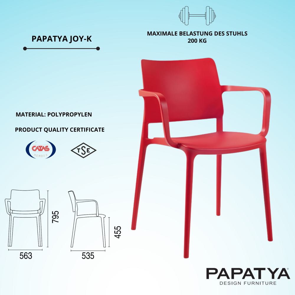 Bequemer Sessel Joy-K mit mattem Finish wird eine hervorragende Leistung im Inneren eines Cafés, einer Sommerterrasse, in der Landschaft Ihrer eigenen Gegend sein. Das Produkt hat ein Monoblock-Design, es ist sicher und praktisch. Polypropylen, aus dem das Modell besteht, ist beständig gegen Temperaturänderungen, Feuchtigkeit und UV-Strahlung. Sessel ist für den Innen- und Außenbereich konzipiert und behält sein hervorragendes Aussehen und seine einwandfreie Qualität über die gesamte Lebensdauer.