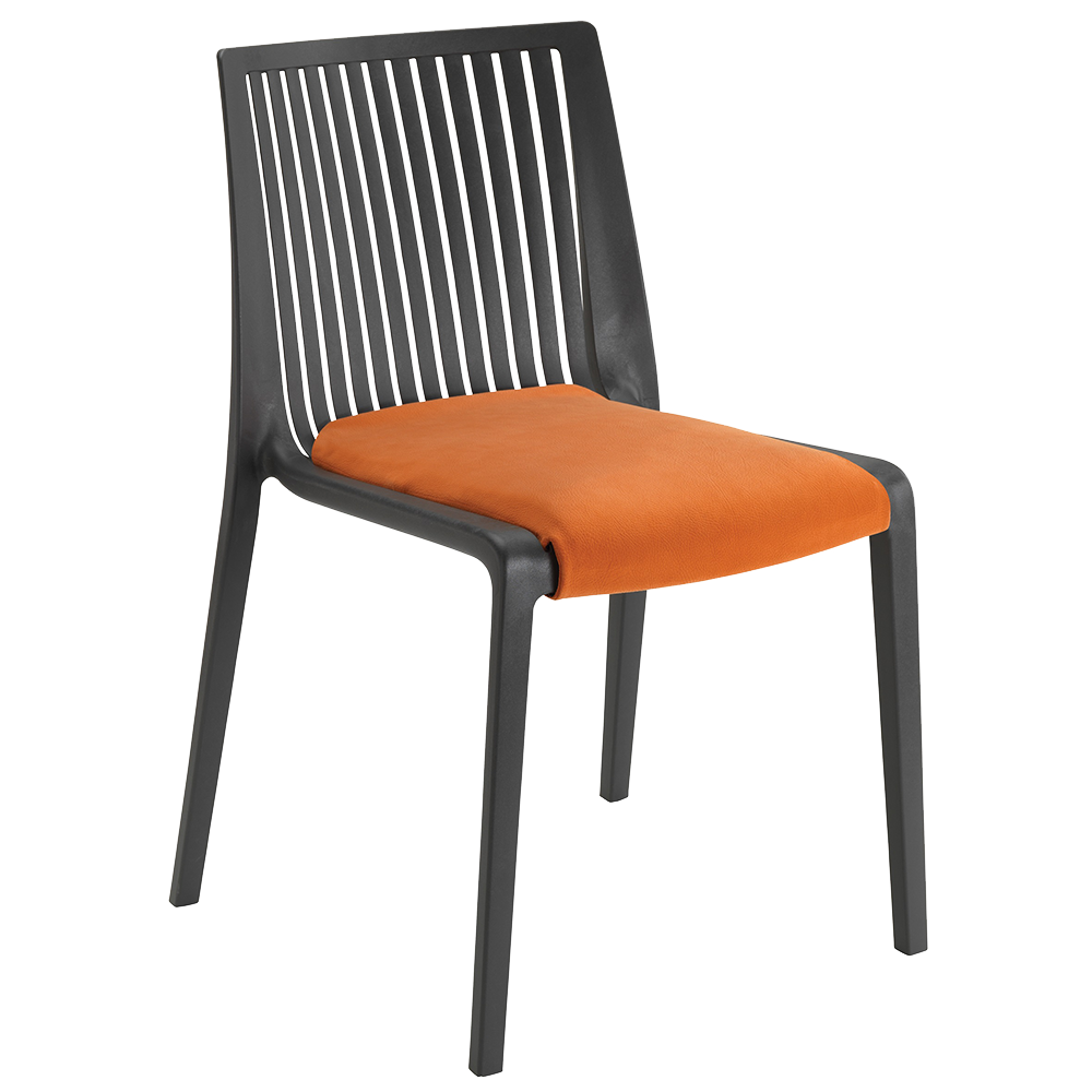 Cooles Stuhlkissen. Das Kissen besteht aus Valencia-Stoff - Kunstleder mit außergewöhnlicher Festigkeit für den Innenbereich. Pflegeleicht und extrem langlebig, ideal für Orte mit intensiver Nutzung und im Horeca-Segment. Valencia-Stoffe sind behandelt, um sie vor Mikroorganismen und Schimmel zu schützen, und werden von den europäischen Brandschutznormen als feuerbeständige, nicht brennbare Beschichtung eingestuft. Dieses Kissenmodell ist abnehmbar und lässt sich je nach Stuhlmodell einfach mit einem Reißverschluss oder Klettverschluss auf dem Sitz anbringen.